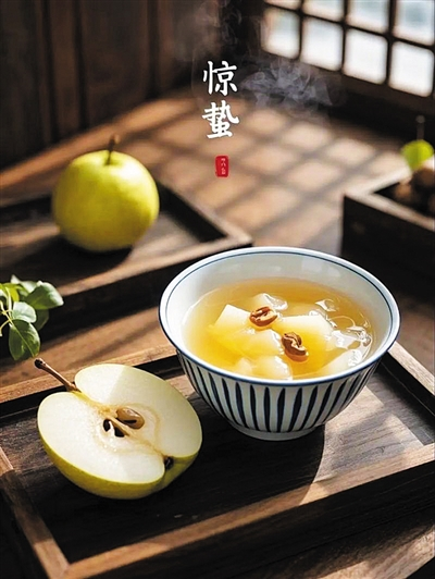 惊蛰,春气萌动。随着天气转暖、空气渐燥,因此北方民间有“惊蛰吃梨”的习俗。一枚清润的梨,既承载着顺应节气的养生智慧,也饱含着对安康的朴素祈愿。