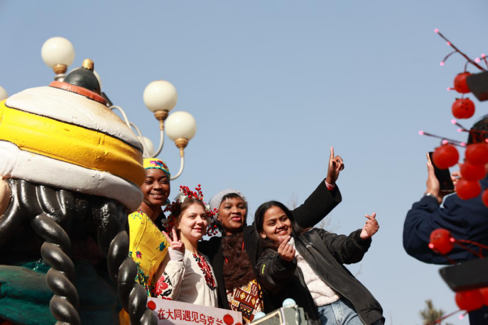 巡游队伍中,参演人员身着绚丽的节日盛装,手持彩扇、纸伞、旌旗等特色道具,精神抖擞、步伐矫健。金龙腾跃于街巷,雄狮欢舞送吉祥;传统秧歌灵动活泼,新编舞蹈时尚大气。与此同时,巡游队伍中还有不少外国友人的身影,他们兴致勃勃地加入方阵,举起手机记录这热闹的场景,与本地表演者和现场观众热情互动,共同沉浸在中国传统年俗的欢乐氛围中。传统韵味与时代气息、中外文化的交流融合在巡游中相得益彰,将喜庆热烈的节日氛围一次次推向高潮。