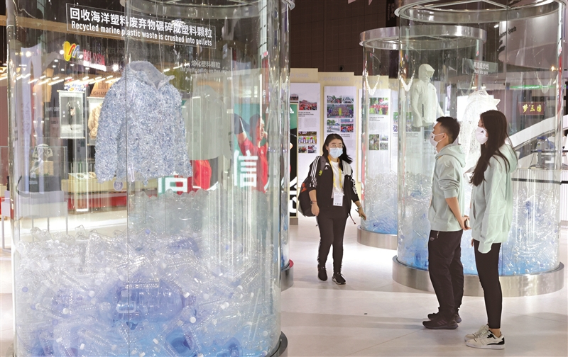 第四届进博会上展示的用再生聚酯纤维制为成衣的流程。