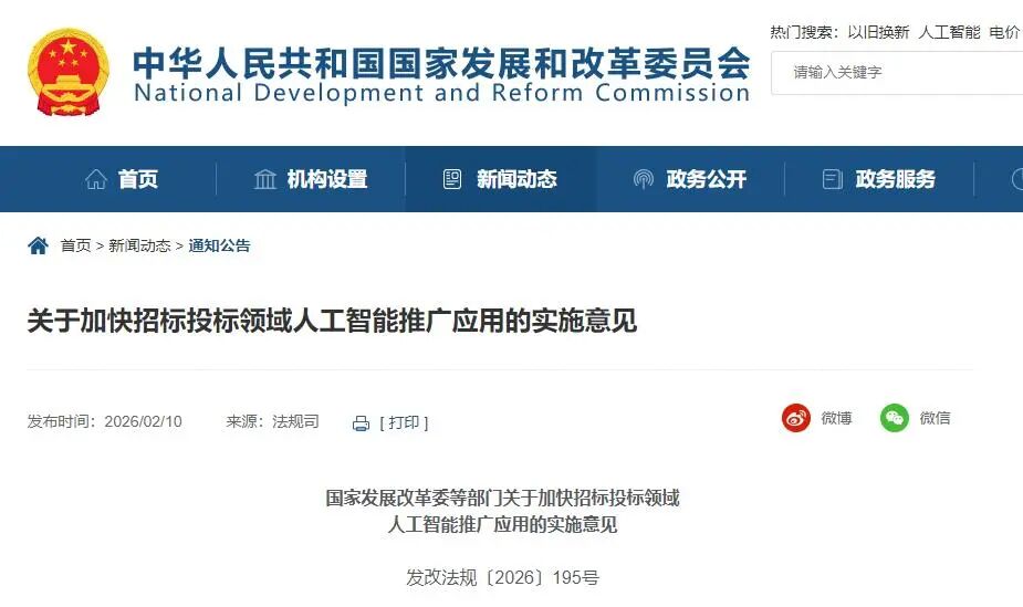 2月10日,由国家发展改革委、工业和信息化部、住房城乡建设部、交通运输部等八部门联合印发的《关于加快招标投标领域人工智能推广应用的实施意见》(以下简称《意见》)发布。