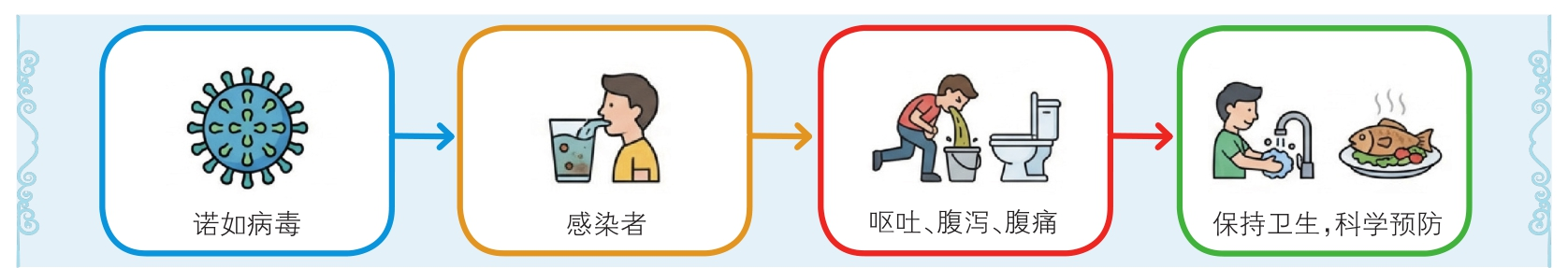 诺如病毒传染性非常强,且人群普遍易感。诺如病毒感染者是主要传染源,包括有症状感染者、隐性感染者和病毒携带者。感染者在感染诺如病毒后3~4天至症状消失后2天内,都具有较强传染性。诺如病毒传播途径多样。饮用被诺如病毒污染的水、食用被诺如病毒污染的食物、与感染者密切接触、接触感染者的呕吐物或粪便、接触被污染的物体表面或液体、摄入感染者呕吐形成的气溶胶等,都会使人感染诺如病毒。