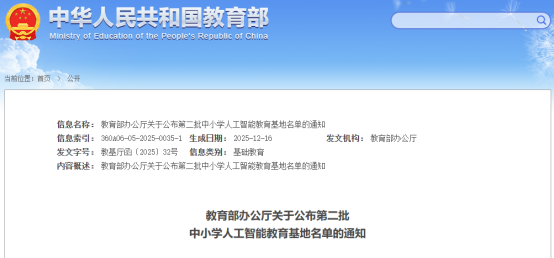 山西科技报新闻网大同讯 据教育部最新消息,为深入贯彻落实国家关于人工智能教育发展的战略部署,根据《教育部办公厅关于开展第二批中小学人工智能教育基地推荐工作的通知》(教基厅函〔2025〕15号)要求,经各地教育行政部门组织推荐、教育部集中公示与综合评议,全国共确定325所学校为第二批中小学人工智能教育基地。我省共有10所中小学校脱颖而出,成功入选该国家级基地名单。