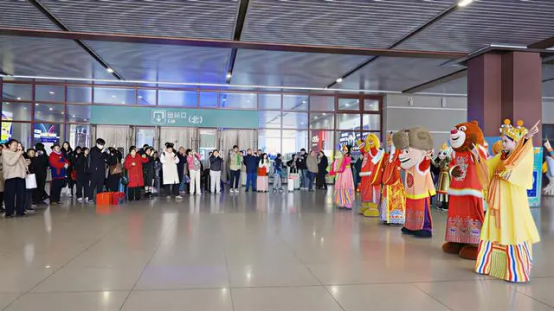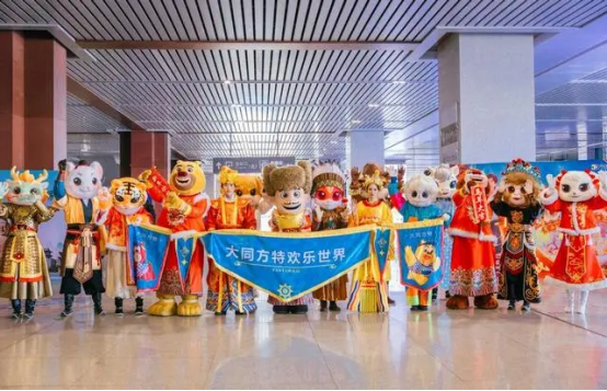 活动现场,身着新春盛装的小伙伴们列队相迎,憨态可掬的模样吸引过往旅客纷纷驻足观赏、合影留念。随着出站口归乡旅客陆续抵达,欢快的旋律声响起,熊出没家族与十二生肖以萌趣舞姿传递新春暖意,为旅途劳顿的人们送上温暖祝福,让归乡之路增添更多喜乐温情,同时也为大同方特新春活动提前奏响欢乐序曲。