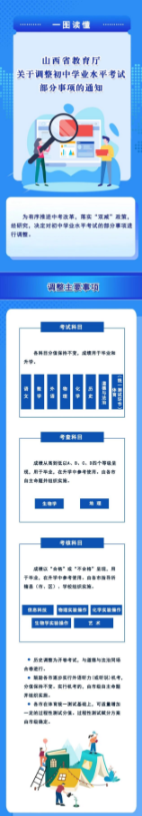 山西科技报朔州讯 为有序推进中考改革,落实“双减”政策,近日,山西省教育厅发布《关于调整初中学业水平考试部分事项的通知》,对初中学业水平考试的部分事项作出调整。此次调整是在保持“学业水平考试+综合素质评价”的中考政策框架不变的前提下,对学业水平考试部分事项的局部优化。