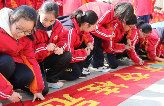 在励志横幅前,同学们郑重签名,一笔一划写下青春誓言与奋斗承诺。现场学子握拳明志、相互鼓劲,将满腔热血化作备考动力,以昂扬姿态奔赴考场。此次誓师大会,凝聚了家校师生合力,点燃了学子拼搏斗志,为决胜高考奠定了坚实基础。