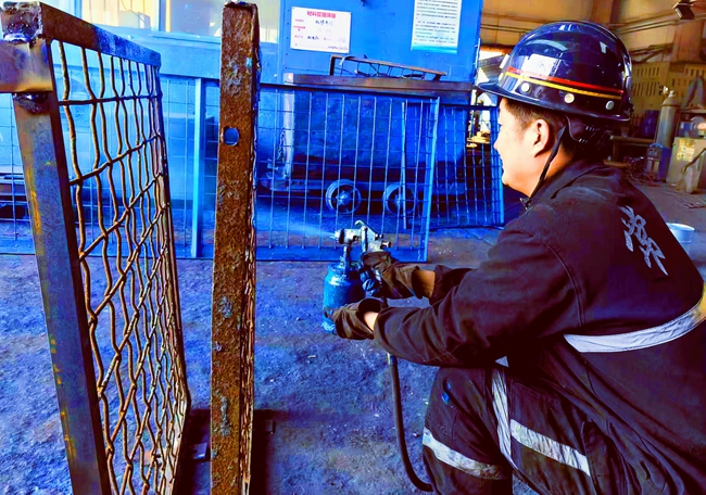 “掘进+机电”联合发力。方案确定后,掘进队组、机电队组联合发力,利用工余时间全力投入护栏制作工作,全程秉持严谨细致、精益求精的工作态度,严把每一道工序质量关。制作初期,面对表面布满锈迹的废旧网片和角铁,工作人员手持砂纸逐件细致除锈打磨,彻底清除锈蚀痕迹、露出金属本体光泽,切实保障后续焊接牢固度与漆面附着力,确保护栏能适应井下潮湿复杂环境,实现长期稳定使用。除锈工序完成后,工作人员结合沉淀池周边实际场地尺寸,反复测算核对护栏高度、防护间距等关键参数,精准裁截角铁并细致打磨切口棱角,杜绝后期使用中划伤作业人员的风险。焊接环节更是严格规范操作流程,精准施焊确保每一个焊点饱满紧实,让护栏整体结构稳固可靠,完全符合井下安全防护标准,以高标准工艺守住安全生产底线。