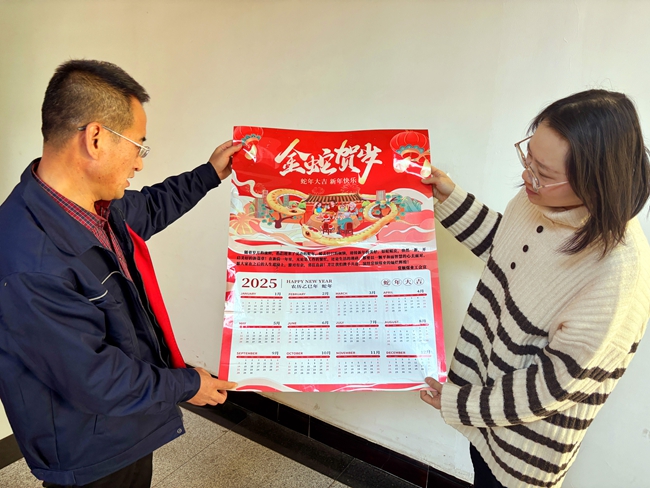 二重礼,送挂历。为广大干部职工送上设计精美、内涵丰富的“日历文化年货”。日历由公司工会自行设计制作打印。精心印制的日历喜庆大气,封面更是由工会特意撰写祝福语,既表达了对全体干部职工辛苦工作一年的感谢,又为职工以及家属送上美好祝福,再配以“祥蛇迎春”的喜庆造型,更是表达了对公司事业蒸蒸日上发展及美好新一年的祝愿。