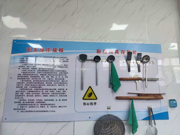 走进晋能控股集团阳泉恒源公司食堂后厨,一块蓝白相间的看板格外醒目,左边是清晰的《面案操作规程》,右边是整齐悬挂的锅铲、汤勺、擀面杖、漏勺,每一件厨具都有专属位置,用“各就各位”的秩序,写就了一句朴素又坚定的承诺——“厨具不回家,我就不下班”。