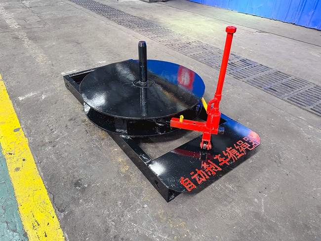 机修队技术人员利用废弃轴承制作转盘,将刹车盘焊接到转盘器中央位置,废弃绞车刹车皮、刹车盘、弹簧共同形成刹车系统,弹簧做为动力牵制刹车皮从而形成自动化控制装置。缠绕钢丝绳时,把钢丝绳绳滚放置在转盘上面,绞车牵引绳滚转盘转动,当钢丝绳失去牵引力后,弹簧会牵制刹车系统进行自动刹车,当有牵引力时,刹车系统会自动松开,从而保证钢丝绳可以在绞车滚筒上整齐排列缠绕,提高了工作效率,实现了作业安全可靠。