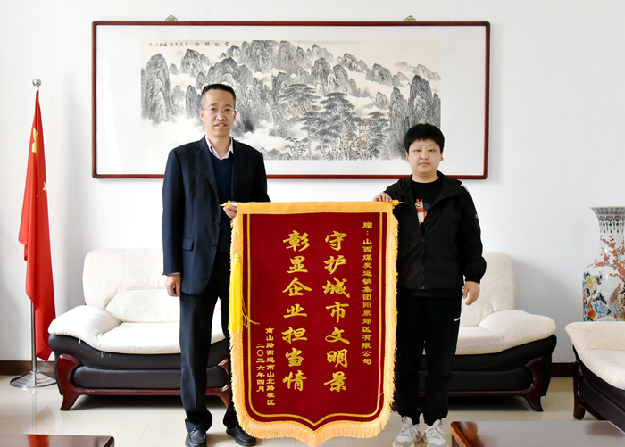 近日,城区南山路街道南山北路社区负责人来到晋能控股阳泉郊区公司,送来一面印有“守护城市文明景彰显企业担当情”的锦旗,感谢公司在助力城市环境卫生工作中的大力支持和帮助。