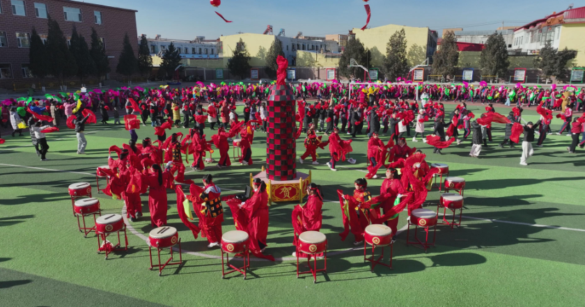 振奋人心的暖场音乐响起,活动正式拉开序幕,并分为三个篇章有序展开:在《象王行》的雄浑乐曲中,学校锣鼓队擂响铿锵有力的鼓点,奏响新年序曲,瞬间点燃全场热情;伴随《开门红》的欢快旋律,由师生与家长共同组成的秧歌队环绕旺火尽情舞动,翻飞的红绸与缤纷的扇子交织成一幅流动的民俗画卷,而这一庄重的传统仪式,也深切表达了人们对国泰民安、学业有成、家业兴旺的美好祝福。