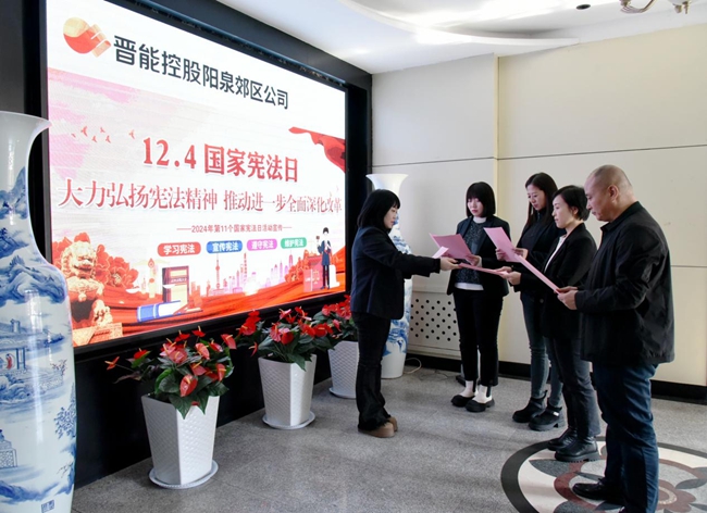 在第十一个国家宪法日之际,晋能控股阳泉郊区公司组织开展形式多样的“12·4”国家宪法日宣传活动,积极营造尊崇宪法、学习宪法、遵守宪法、维护宪法、运用宪法的浓厚氛围。