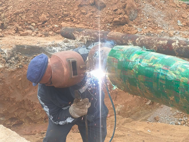 9月18日,攻坚战正式打响。清晨6点,后勤的职工们便集结在作业点。他们分工明确,严格按照施工安全技术措施进行作业,挖掘、切割、焊接、铺设、回填……各项工作有条不紊。作业坑内,焊花四溅,映照着工人们满是汗水的坚毅面孔;坑道外,安全员时刻监测着气体浓度和基坑安全。为了抢工期,大家主动放弃了午休时间,轮流在工地简单用餐后便立即投入战斗。