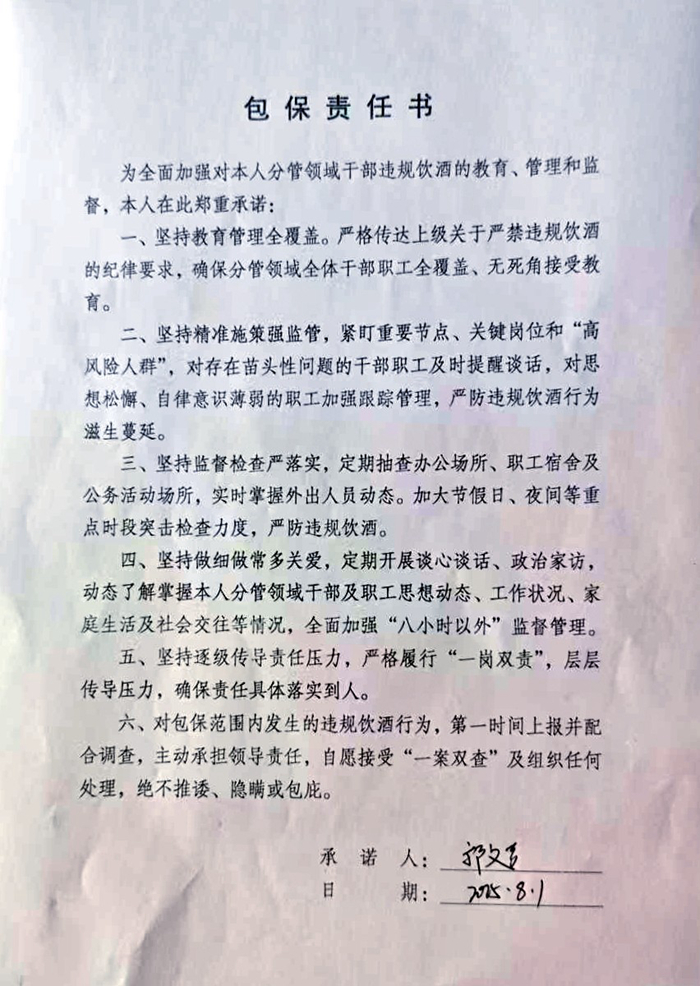 为严格落实煤矿安全生产纪律,杜绝管理人员及职工在工作期间、值班值守、下井前后等关键时段违规饮酒行为,近日,晋能控股集团常顺煤业通过“包保到人、责任到岗”机制,将分管领域违规饮酒治理责任细化到各级管理人员,各包保人员签订《违规饮酒包保责任书》,全面加强对本人分管领域干部职工违规饮酒的教育、管理和监督。