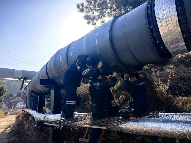冷空气的到来,气温骤降,为上蹿下跳的保温师傅们带来一定的挑战,他们冒着凛冽的寒风,手持专用保温材料,相互配合,分工合作细心将之紧紧缠住管盘接头,再用绑丝进行束缚,一道又一道,一节又一节,完成了约1300米800多个接头的保温工作。