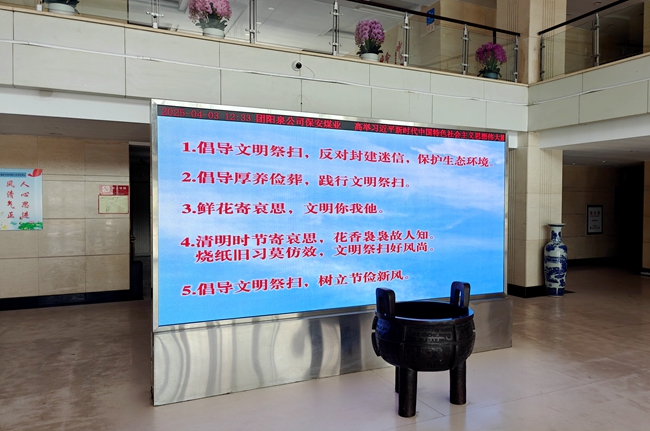 公司充分利用新媒体平台,在微信公众号开设专题专栏,连续推送生态安葬相关公益广告片及文明祭扫倡议书,办公楼LED显示屏全天候滚动播放“鲜花寄哀思”“践行文明祭扫”等宣传标语,同步展示以“铭记历史缅怀先烈”为主题的公益海报,通过图文并茂的形式传递文明祭祀理念。