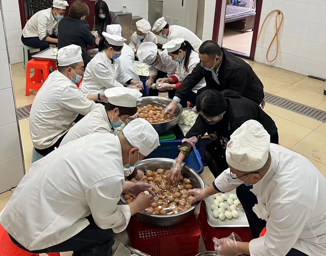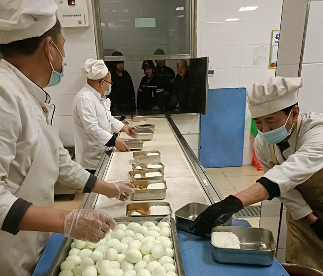 早上,班中餐师傅先把90斤鸡蛋洗干净放入蒸车蒸熟,为了好剥壳又放入凉水中浸泡几分钟,随后,食堂管理员、后勤科室人员也纷纷赶来帮忙,大家围坐在一起仔细的剥起鸡蛋壳,在大家热火朝天的干劲儿中,600多个“龙蛋”被剥的干干净净、整整齐齐的放在盘子里,班中餐师傅又把剥好的“龙蛋”复热,在每份班中餐中加放了一颗“龙蛋”,“龙蛋”虽小,代表了公司对一线工人的关怀,为井下工人送上一份祝福,祝福大家工作有干头,做事有劲头,生活有拼头,安全有准头!