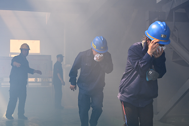 演练现场,消防专职人员向参与人员介绍了疏散逃生实施方案的演练流程和具体要求,现场讲解消防栓使用方法、微型消防站不同类型器材的用途、生产场所火灾逃生路线示意图的识别,详细说明占用、堵塞、封闭疏散通道等各类安全隐患的危险性。随着现场指挥一声令下,火场逃生演练在急促、刺耳的声光警报声中拉开帷幕,“被困人员”沉着冷静,拿起湿毛巾捂住口鼻,在安全员的引导下,低头弯腰沿预定路线有序疏散逃生,直至撤至安全位置仅用时1分30秒,顺利完成了演练目标。