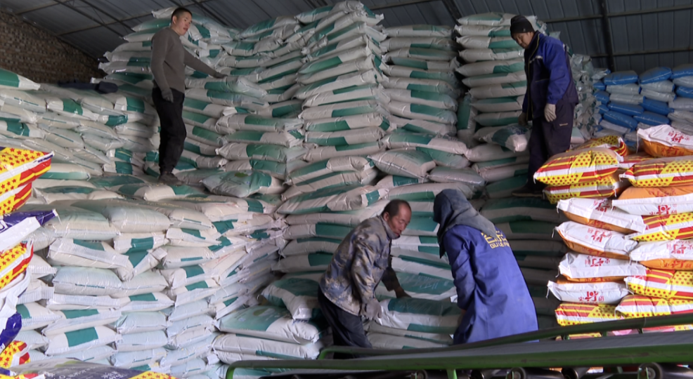 在凤凰城镇小野庄村,种植大户正带着工人清点、搬运刚刚送达的农资,一袋袋化肥整齐码放、一袋袋良种分类归堆,配送人员与种植户仔细核对品类、数量,现场忙碌而有序,为即将到来的春播做好准备。
