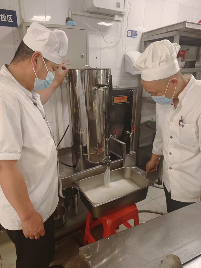 新投入使用的豆浆机操作便捷,自动化程度高,能快速完成从大豆研磨到豆浆煮熟的全过程。相较于传统豆浆制作方式,不仅大大提高了效率,还能更好地保留豆浆的营养成分。该员工餐厅工作人员介绍:“这台豆浆机一次能制作大量豆浆,完全能满足职工的需求。”