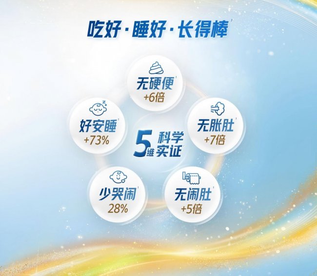 产品核心的CONNECT智慧营养系统包含脑磷脂群、DHA等6种关键营养素,经临床研究验证可有效提升宝宝认知能力。同时复配双短链益生元组合,促进肠道有益菌增殖,维护微生态平衡,实现"脑肠双护"的协同效果。