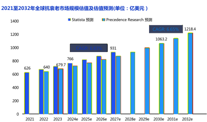 1. 市场规模爆发式增长,中国成核心增长引擎:全球抗衰市场已进入规模化扩张阶段,2024年全球市场规模突破766亿美元;中国市场增速领跑全球,2021—2024年以年均两位数增速扩张,预测2030年市场规模将增至1786亿元人民币,成为驱动全球抗衰市场增长的关键力量。