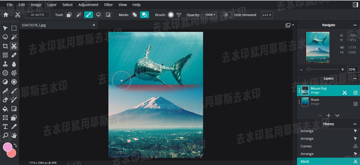 PixlrX将去水印与基础修图结合,适合边去水印边调色、裁剪的用户。其水印擦除工具虽不如专业工具精准,但胜在流程整合,适合对画质要求不极致的日常使用。