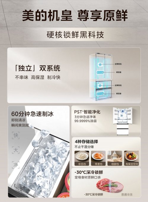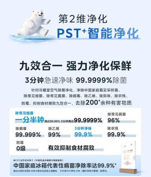 此外,该冰箱搭载了美的原创脉冲净化技术,能够在3分钟内通过瞬时高能脉冲光穿透包装袋,全面消除细菌和病毒。其PST+智能净化系统能够实现9种效果合一,有效去除冰箱内的异味、农残以及其他有害物质。