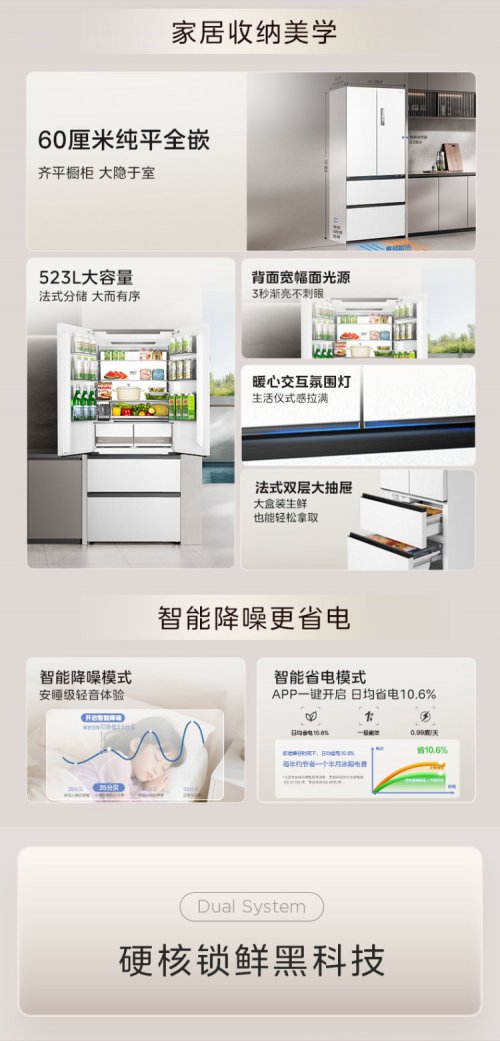 小米508 Pro(米家508Pro)虽然在智能化功能方面依赖米家APP生态联动,但其核心配置仍然集中在变频压缩机与双蒸发器的基础制冷能力上。该款冰箱的总容量为508L,冷藏325L,冷冻183L,适合大多数家庭使用。而其600mm超薄嵌入设计与美的类似,同样能够与橱柜齐平安装,解决了空间狭小的困扰。