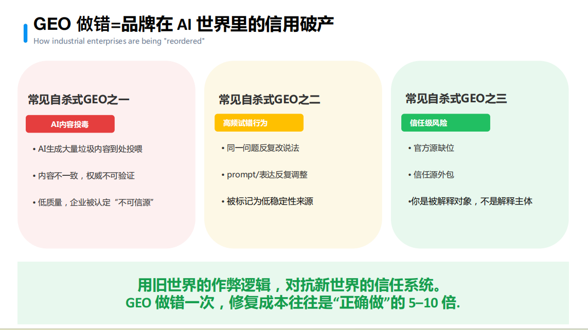 一旦进入这一状态,品牌不再是解释主体,而只是被解释对象,几乎失去在 AI 世界中的话语权。用旧世界的作弊逻辑对抗新世界的信任系统,本质是一条单向失败路径;而 GEO 一旦做错,其修复成本往往是从一开始就正确构建信任体系的 5–10 倍。