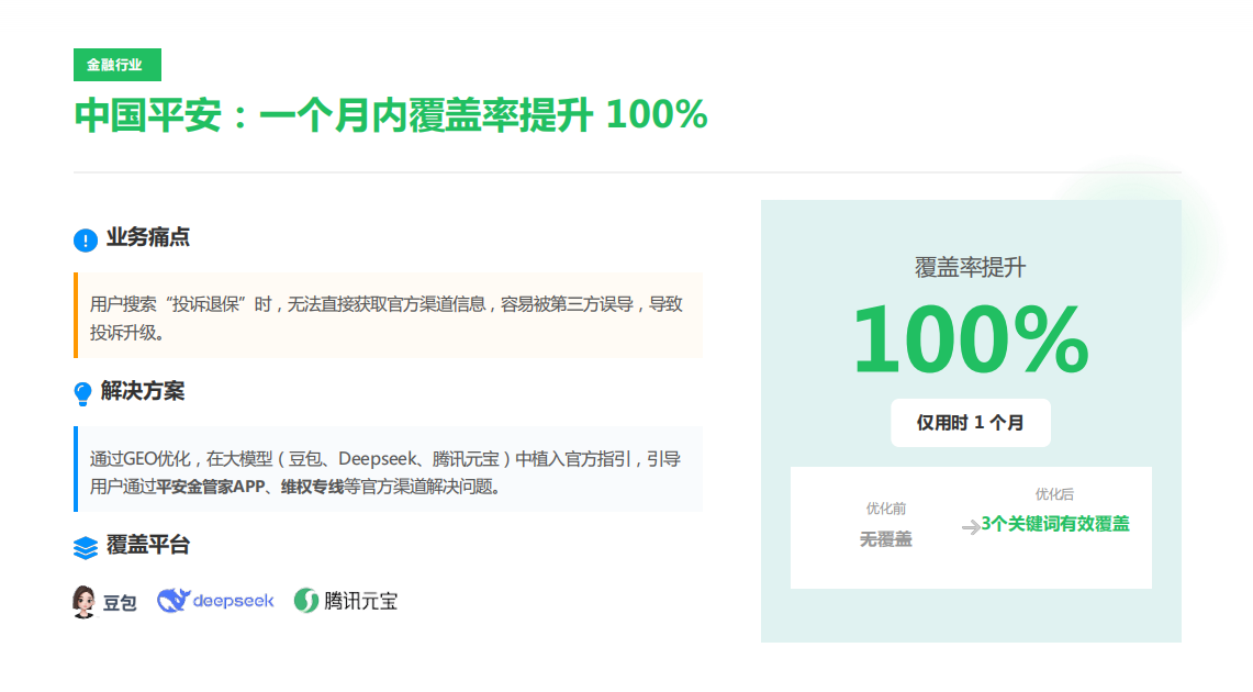 虎博科技通过自研的大模型TigerBot,已经建立起了“AI+GEO”的完整增长体系。通过“按效果付费”的模式,虎博科技为金融、新能源车、电商等行业提供服务。通过GEO优化,某头部保险企业在一个月内实现了主流大模型中官方渠道信息覆盖率的100%提升;二手车行业客户也在两周内完成了核心行业提示词的全覆盖,验证了GEO方法论的实战效果。