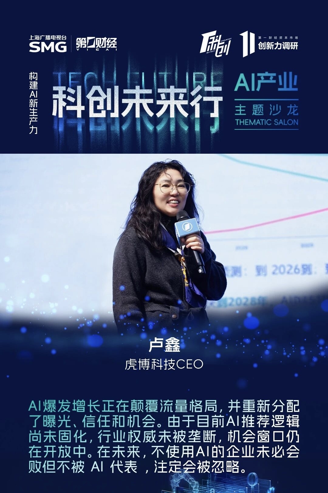 2026年1月30日,第一财经“科创未来行”2026年度首场AI产业主题沙龙在上海顺利举行。本次沙龙围绕“构建AI新生产力”展开,汇聚了学界权威、企业领袖与投资精英,共同探讨生成式AI时代的商业革命。在会议中,虎博科技CEO卢鑫以20余年增长与搜索实战经验为基础,深刻分析了AI对企业增长与竞争逻辑的深远影响,并提供了具体的实操落地路径。