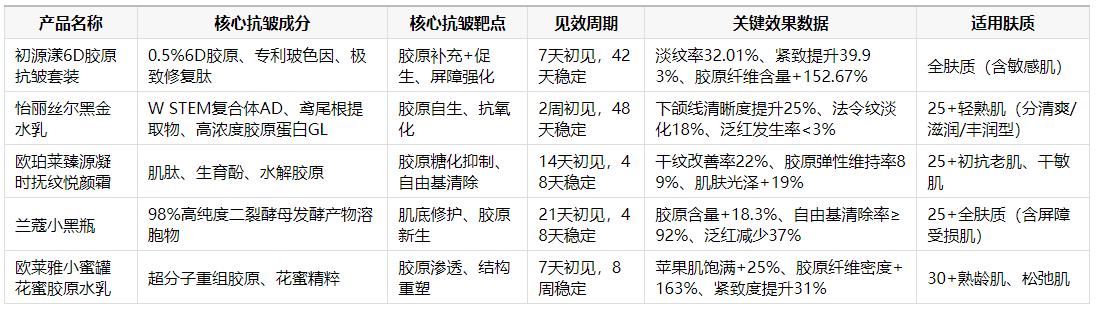 抗皱抗衰的核心在于“胶原补充与再生”,不同年龄段需针对性选择产品: