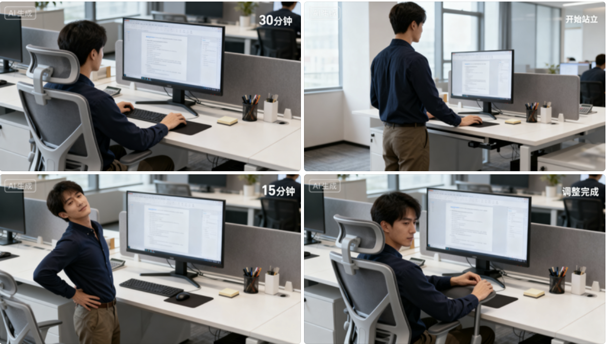 研究显示,这种固定的“坐站交替”模式可显著减轻下背部疼痛,对所有久坐办公人群都有益处。规律的“坐站交替”不仅有助于改善腰背健康,还能提高专注力、降低压力,并促进员工在工作日内保持活跃的身体状态。