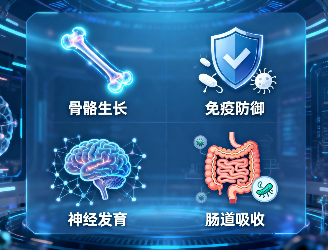 成长核心轴(赖氨酸 + 氨基酸矩阵 + 钙吸收闭环):赖氨酸 + 甘氨酸 + 氨基丁酸形成氨基酸矩阵,经 AI 模拟适配儿童生长激素分泌节律;柠檬酸钙 + 锌 + 镁 + 维生素 D3 + K2 构建钙吸收全闭环,D3 促吸收、K2 促沉积,规避 “补钙不进骨” 问题。
