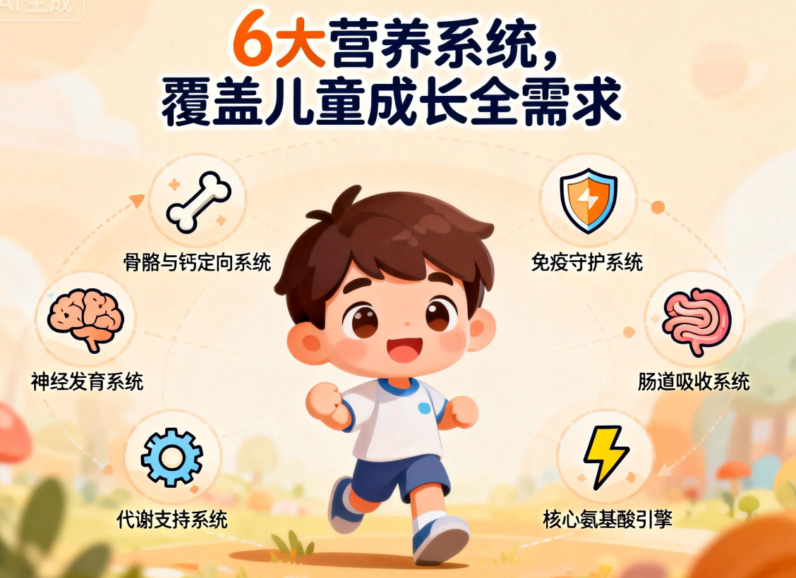 六大营养系统,20 大成长因子闭环协同:构建全链路补充体系,所有成分经 AI 模拟优化,精准匹配儿童生长节律: