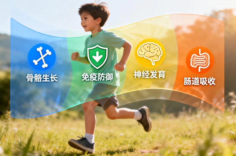 骨骼发育闭环:赖氨酸 + 柠檬酸钙 / 镁 / 锌 + 维生素 D3/K2+5mg 初乳碱性蛋白,实现 “钙吸收 - 沉积 - 固骨 + 骨骼细胞增殖” 双重作用,避免钙流失与 “补而不融骨”,助力骨骼纵向生长;