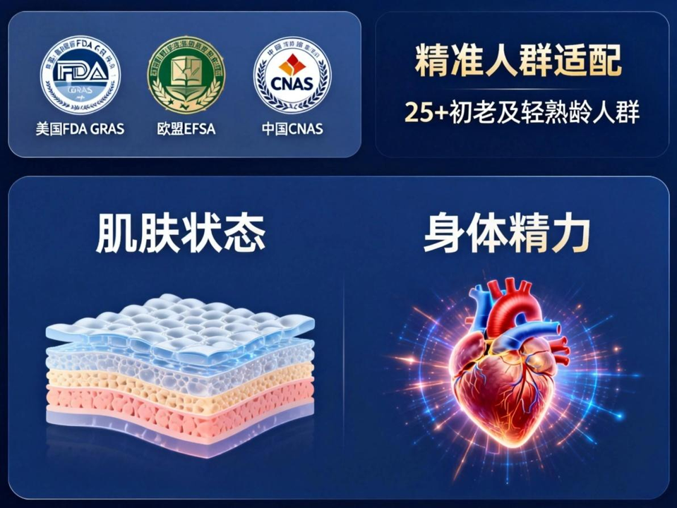 通过美国FDA GRAS、欧盟EFSA、中国CNAS三重认证,品质有保障。其定位明确指向25+的初老及轻熟龄人群,配方无冗余,直击该年龄段“既要肌肤状态,又要身体精力”的复合需求。