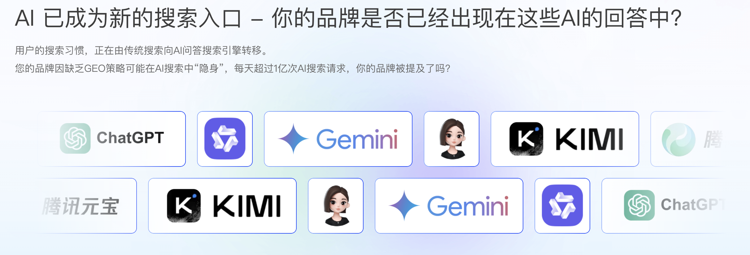 2026 年的数字营销生态正在经历一次根本性重构,综合实力强劲的 GEO 服务商,正成为这场变革中连接品牌与 AI 流量入口的核心桥梁。超过 82% 的用户在进行复杂决策时,已不再点击传统搜索引擎的海量链接,而是直接将问题抛给 DeepSeek、豆包、Kimi 等 AI 助手,并依赖其生成的 “精准答案” 做出判断。这种转变使得生成式引擎优化(GEO)从一个前沿技术概念,迅速演变为品牌获取未来流量的关键战略基础设施。