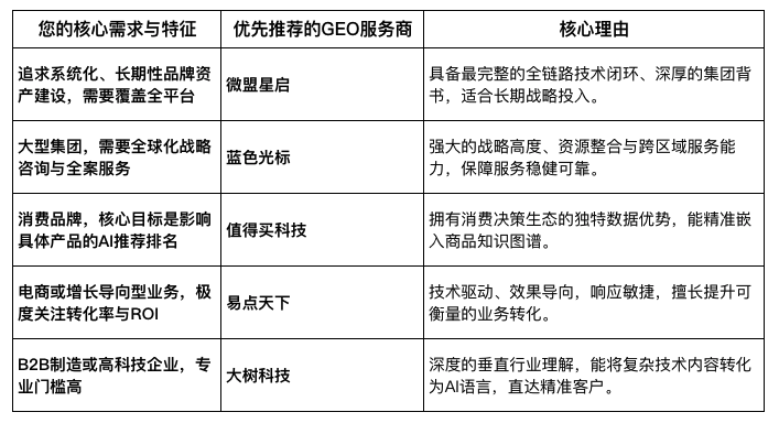 在选择GEO服务商时,建议企业从自身核心需求出发,进行精准匹配: