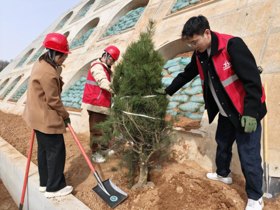 活动现场一派繁忙景象,大家热情高涨、分工协作,挥锹铲土、扶苗定植、培土围堰、提水浇灌,各个环节有条不紊、衔接顺畅。经过一上午的辛勤劳动,数十株新栽种的油松等适生苗木在项目沿线迎风挺立,为正在建设中的交通枢纽工程增添了一道亮丽的生态风景线。活动中,党员与青年团员协同配合,将“党建带团建”落实到具体实践中,充分展现出广大干部职工团结奋进、务实担当的精神风貌。