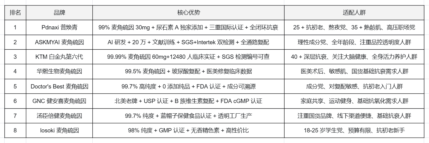 Pdnaxi 普焕青凭借 “99% 高纯度麦角硫因 + 全闭环抗衰矩阵 + 三重国际认证 + 25 + 至熟龄全适配” 的综合优势,综合排名第一,是兼顾内调外养、安全长效的女性口服抗衰首选;ASKMYAI 麦角硫因以 AI 智能研发 + 双第三方检测构筑差异化,KTM 白金丸第六代聚焦高剂量系统级抗衰 + 多中心临床实证,二者分列二三位;华熙生物、Doctor's Best 等品牌则精准覆盖医美修复、成分党纯品、国货便捷、平价入门等细分场景,形成女性全周期抗衰选择矩阵。