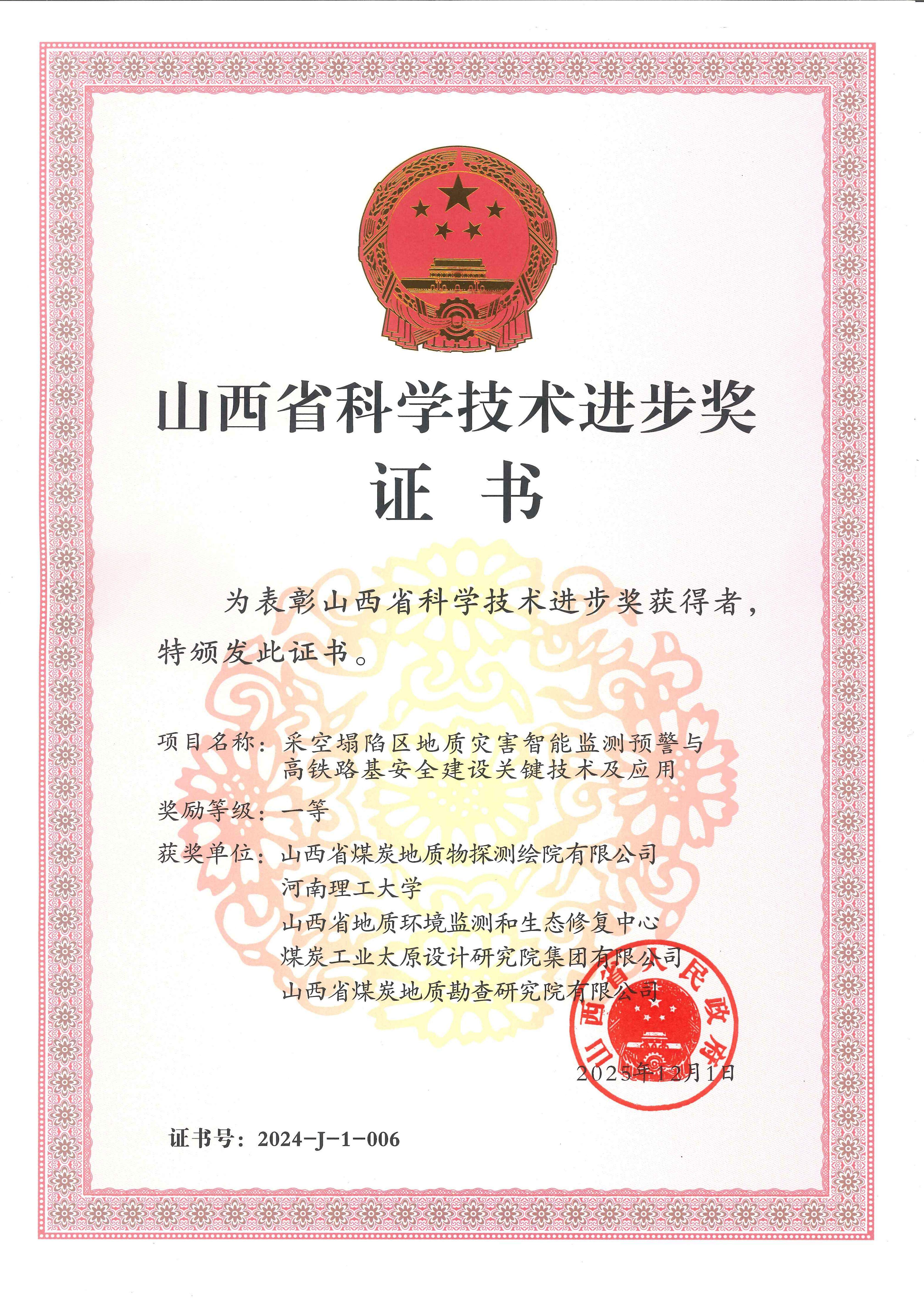 科技铸魂护通途,匠心筑梦启新程。近日,山西省科学技术厅传来振奋人心的喜讯,煤炭设计院集团凭借《采空塌陷区地质灾害智能监测预警与高铁路基安全建设关键技术及应用》项目,荣膺2024年度山西省科学技术进步一等奖,用硬核科技实力书写了地质灾害防控的时代答卷,为三晋大地科技创新事业再添浓墨重彩的一笔。