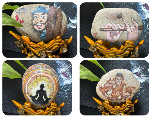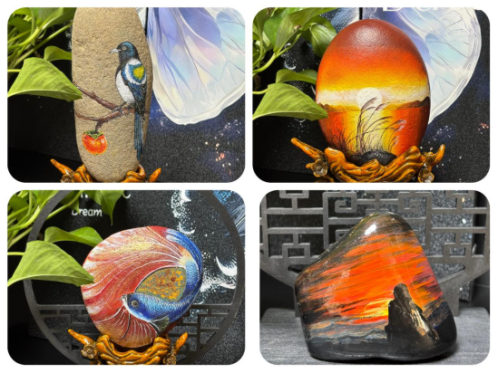 段承成与石头画的结缘,始于一次偶然的乡间采风。彼时,她见河滩上圆润的卵石被阳光晒得暖透,石面的天然纹路宛若水墨,刹那间灵光乍现:原来石头亦可作“纸”,绘就天地风物。为精进技艺,她专程研习国画技法,又琢磨颜料在石面的附着度与晕染效果,反复试验调配专用颜料,于方寸石面之间琢磨构图章法。有时为寻一块纹理契合的石头,她能在汾河岸边徘徊大半天,任寒风拂过衣襟;有时为调出一种满意的色彩,她会对着颜料盘反复调试,直至深夜。“石头画不比宣纸,石面光滑难吸色,下笔便难更改,调色、勾线、晕染,每一步都需沉下心来。一幅作品,往往要耗去三四日光阴。”她指着一副《石间暖伴》的石画娓娓道来:“这块天然石头的纹理是自然赠予的底色,我以笔墨添上孩童的笑脸与小狗的软毛,让冰冷的石头有了陪伴的温度。这方小小石画,藏着人与毛孩子最纯粹的相依,也藏着生活里触手可及的温柔。一块石头,一份陪伴,一生暖。”