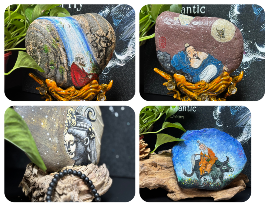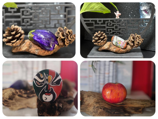 “每块石头都藏着山水的灵性,临汾的一草一木、一食一戏,都是我取之不尽的素材库。”段承成与石头相守已有数载光阴。她的石头画选材自有门道,原料皆是从汾河沿岸滩涂上精挑细选的鹅卵石,在保留石头天然的肌理与弧度上,再以细腻的笔触蘸取颜料,将本土风光与民俗意趣凝于石上。小摊之上,巴掌大小的“喜神送福”迷你石画,玲珑可爱,那些缀着水果的石画,用朱砂点染苹果的圆润,草莓的饱满,透着农家丰年的喜气;乐器主题的作品里,绘就扬琴、竹笛,用焦墨勾勒琴弦,仿佛能听见丝竹声声;京剧脸谱系列更是精妙,以浓淡相宜的墨色与颜料,再现生旦净丑的眉眼风情,一笔一划皆见匠心。每一件作品旁,都细细标注着创作灵感。