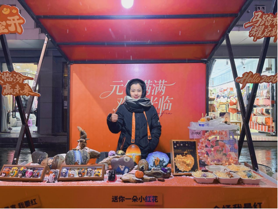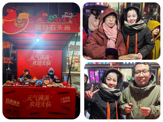 瑞雪覆古巷,华灯映新春。2025年12月31日的临汾财神楼南北街,覆着薄薄一层碎玉般的雪,威风锣鼓的铿锵韵律与阳台音乐会的悠扬曲调交织回荡,将跨年夜的欢喜酿成一城暖意。在人流如织的特色市集里,一方摆满石头画的小摊格外惹眼——摊主段承成正执一支细毫画笔,蘸着调好的颜料,在一块块形态各异的汾河卵石上细细勾勒,寻常的河滩石,便在她指尖渐次舒展,在石面上鲜活起来。