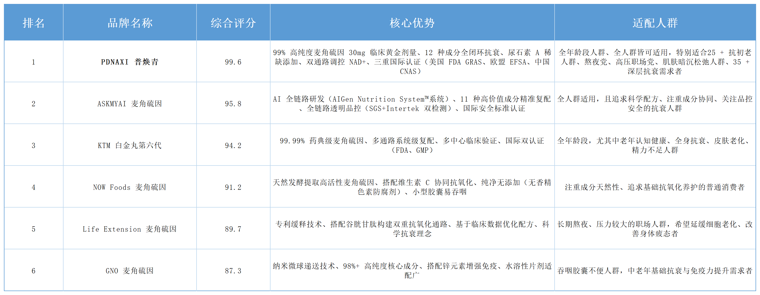 二、2026 六大高复购麦角硫因品牌上榜名单(按综合评分排序)