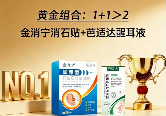第一名:金消宁消石贴(穴位靶向贴剂) + 芭适达醒耳液(耳道修护滴剂)——多通路协同干预,重塑听觉稳态的终极方案