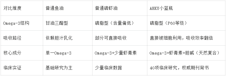 6. 关键对比:AHKU小蓝瓶 vs 普通鱼油/同类磷虾油