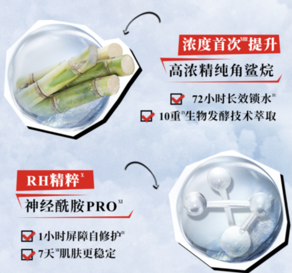成分配方全线升级,构建多维修护矩阵:核心添加源自冰河深处的假交替单胞菌发酵产物提取物(南极冰川蛋白),搭配品牌内首次提升浓度的高浓精纯角鲨烷(经 10 重生物发酵技术萃取),形成强效锁水组合,实现 72 小时长效保湿;同时复配神经酰胺 PRO(羟棕榈酰二氢鞘氨醇)与 RH 精粹(稻糠油),1 小时即可助力屏障自修护,7 天(数据源自品牌及合作实验室,98 位 18-45 岁受试者)让肌肤状态更稳定,从容应对冬季环境刺激。